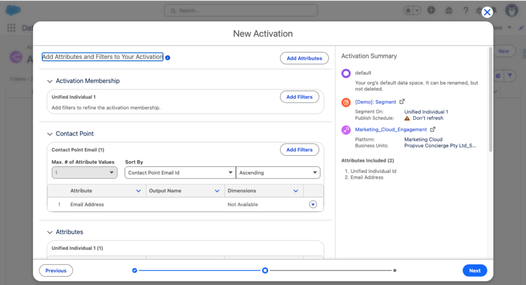 Now you will have the possibility to filter the data that you will be activating in Marketing Cloud Engagement.