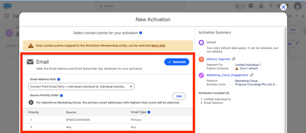 You will now be able to select how Data 360 prioritise how to recognise a customer that will be activated. For example, if we select Email, the default way of prioritisation will be to refer to the email address with the highest click score.