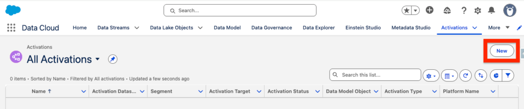 Still in Data 360, select the Activation Tab and click New.
