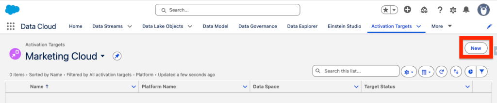 Creating an Activation Target dedicated to Marketing Cloud Engagement is like setting-up a pipeline from Data 360 to Marketing Cloud Engagement. In Data 360, select the Activation Targets tab and click New.