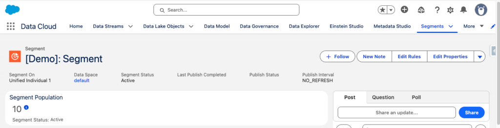In Data 360, navigate to segments and create a new segment. In our case I’ve created a generic segment named [Demo]: Segment