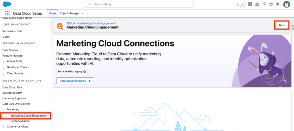 In this is article we will learn how to ingest Data from Marketing Cloud Engagement into Data 360. The very first step is to navigate into Data Cloud set-up and select the tab Marketing Cloud Engagement. After that you can click New.