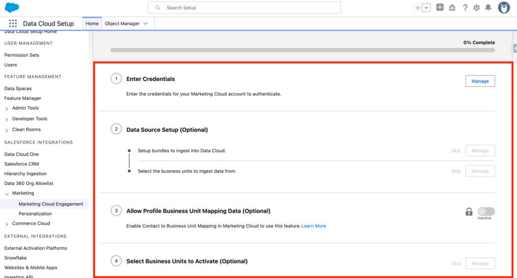 In Data Source Set-up, we will be selecting the Data that can be ingested from Marketing Cloud Engagement into Data 360.
