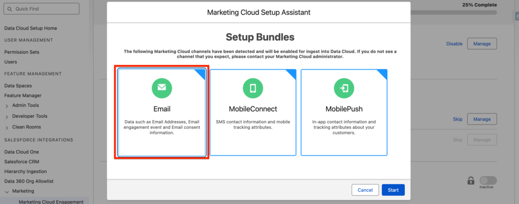 I will then have the possibility to either use a Bundle (Email Studio, Mobile Studio, Mobile Push) or select directly Data Extension from Marketing Cloud Engagement to ingest into Data 360. A Bundle contains pre-configured data streams and field attributes that simplifies the ingestion process.