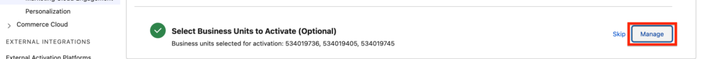 In the Last step of the Marketing Cloud Connector set-up we will select the Business Units that will receive Data or Information from Data360 such as Segments. Click Manage and Select the Business units that can be used as Activation.
