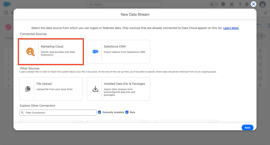 Within the Data360 (Data Cloud) App, I will navigate into the Data Streams App and click New, then select Marketing Cloud. Click Next.