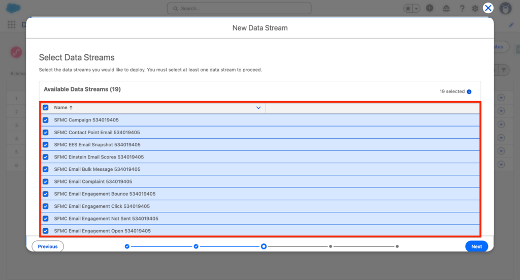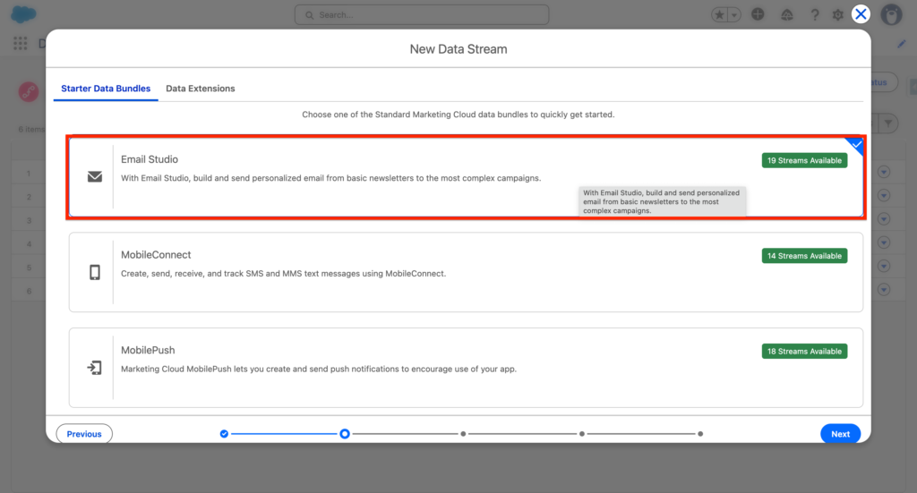 After selecting the Bundle (Email Studio in my case), I will have the possibility to review the pre-selected Data Streams that will be created from the Bundle.