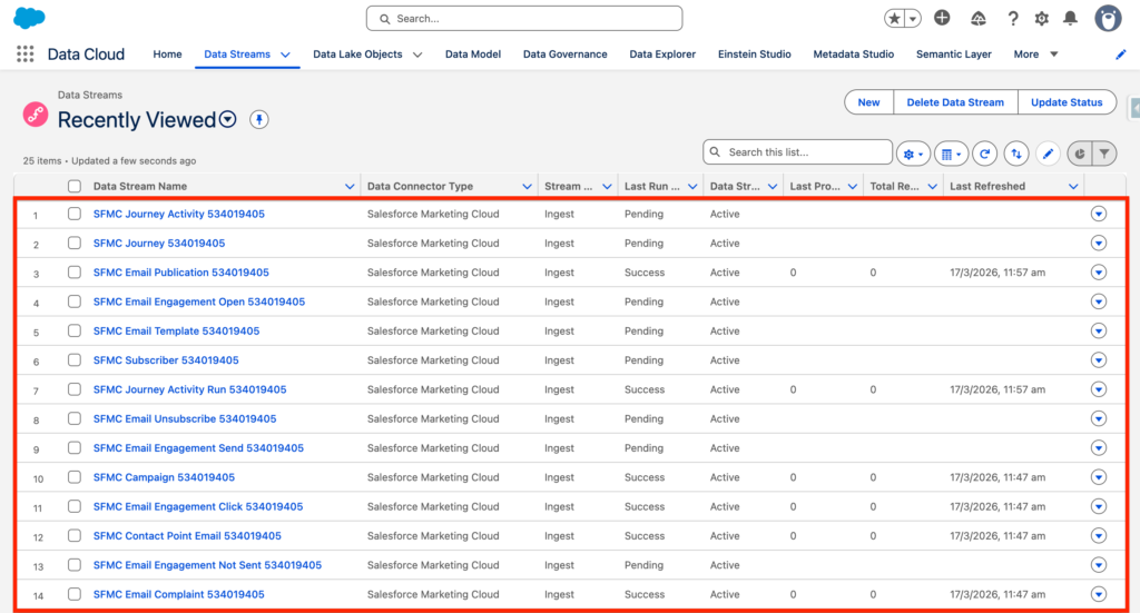 The list of the Marketing Cloud Engagement Data Streams will appear here: