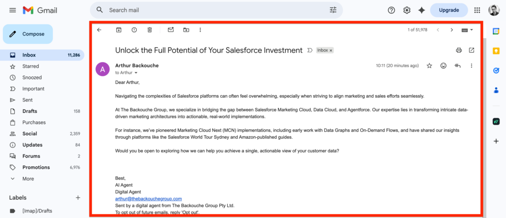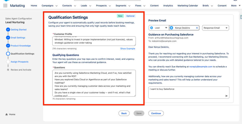 The Agentforce Nurturing Agent is capable of understanding if a lead in Salesforce is likely to become a customer based on specific criteria, as well as interacting with leads via email and measuring their interest in your organization’s products and services. It can also reply to questions asked by the lead within the email thread.