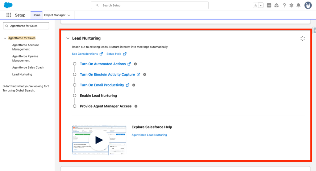 In Salesforce Setup, navigate to Agentforce for Sales, click on the Lead Nurturing tab and scroll down to the Lead Nurturing section. Enable it.