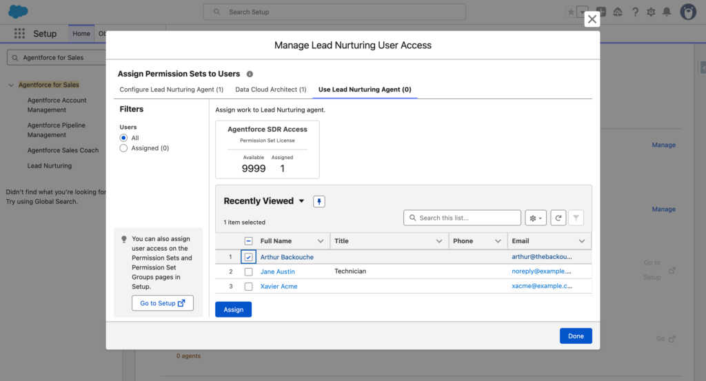 Within the Manage Access for Managers and Users section, you will need to click Manage and assign your user to Use Lead Nurturing Agent. This gives you the permission to create new Lead Nurturing Agent. It is a key requirement for the next steps.