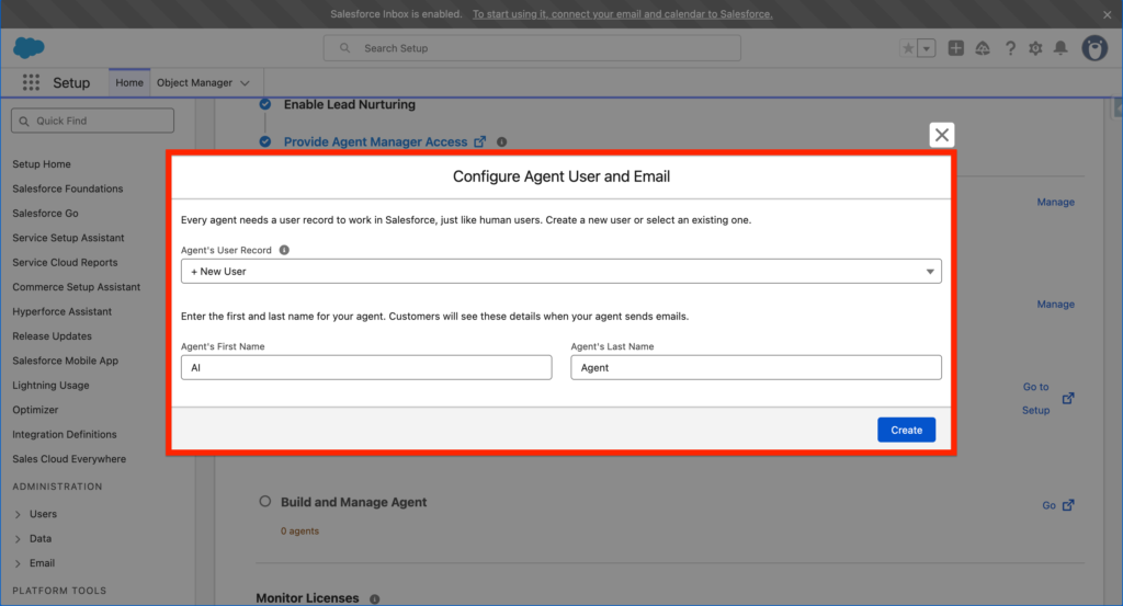 After that, within the Manage Agent’s User Record and Email section, you will need to create a Agent User. An Agent User is like a regular user in Salesforce – it can read, write, delete records based on the permissions associated.