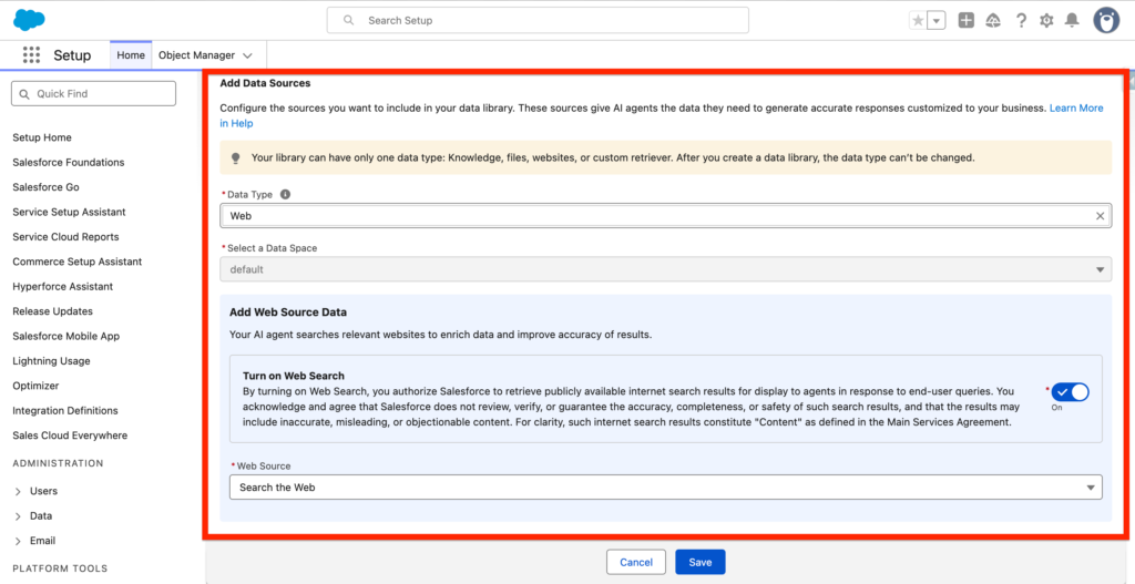 Within the Data Library section you will be able to configure the Data that your agent can access. It can either be your knowledge base, some pdf documents (Unstructured Data), or searching on the web information directly.