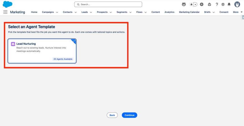 Within the Build and Manage Agent, I’ve clicked Go and I’m now redirected to a guided set-up. I have the possibility to select an Agent Template: Lead Nurturing. In a nutshell, an agent template is a form that will allow you to configure your Agentforce Agent by answering questions on how it should behave.
