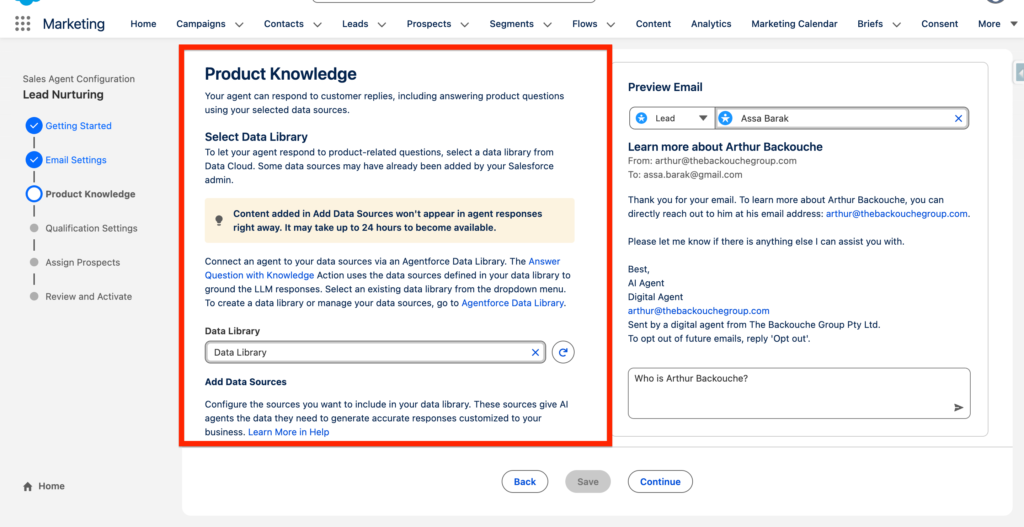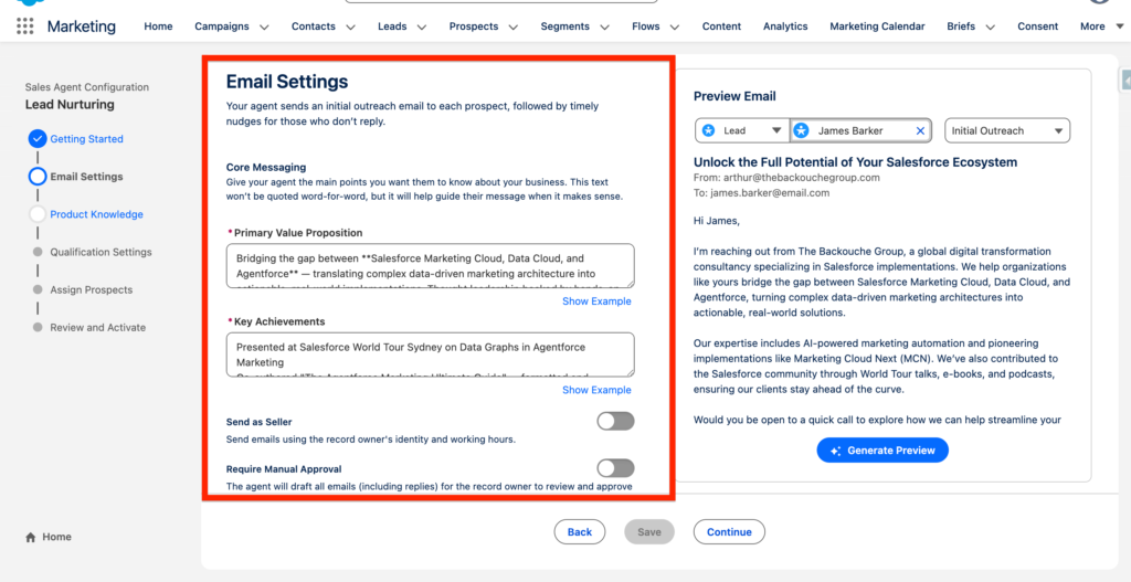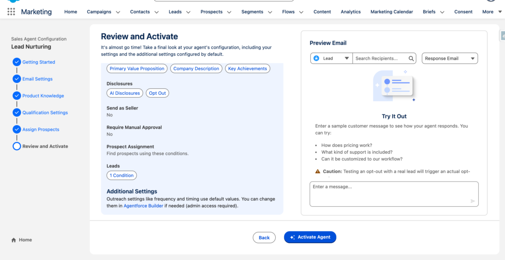 Throughout the guided process of setting up the Lead Nurturing Agent you will need to have answer a range of questions about your organization and the key aspects of it (i.e. What is your activity, how can you help your customers). Based on the questions answered you will be able to Generate a preview of what an Email looks like. You will be able to preview and test with a Lead of your choice.