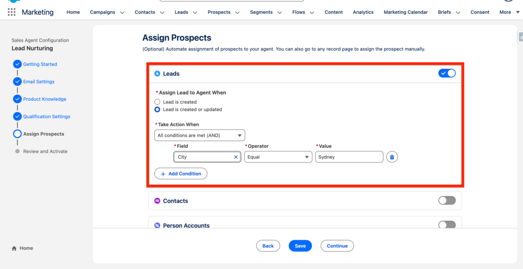 Next, I have added all the conditions to assign the leads to the Agent when they meet specific conditions such as their city or job title. This can be quite interesting. If the Lead that is entering Salesforce or is updated and have field attributes (City, Title) that are equal a value (Sydney, CEO) the Lead will be automatically assigned to the Nurturing Agent.