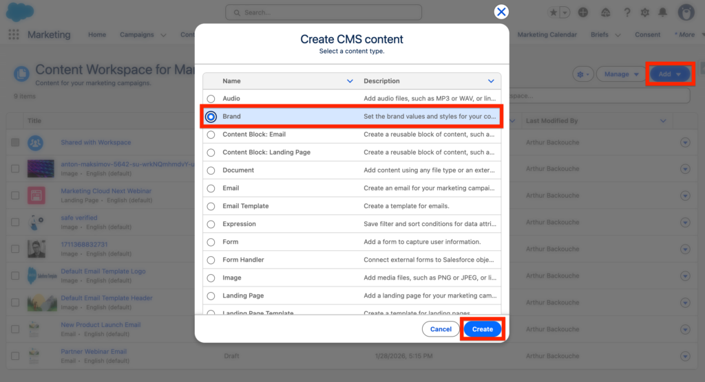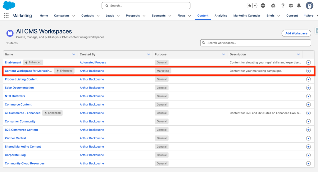 In the Marketing App, navigate to the Content Tab and select the CMS Workspace that you are using within Marketing Cloud Next. In my case, I’m using Content Workspace for Marketing Cloud.