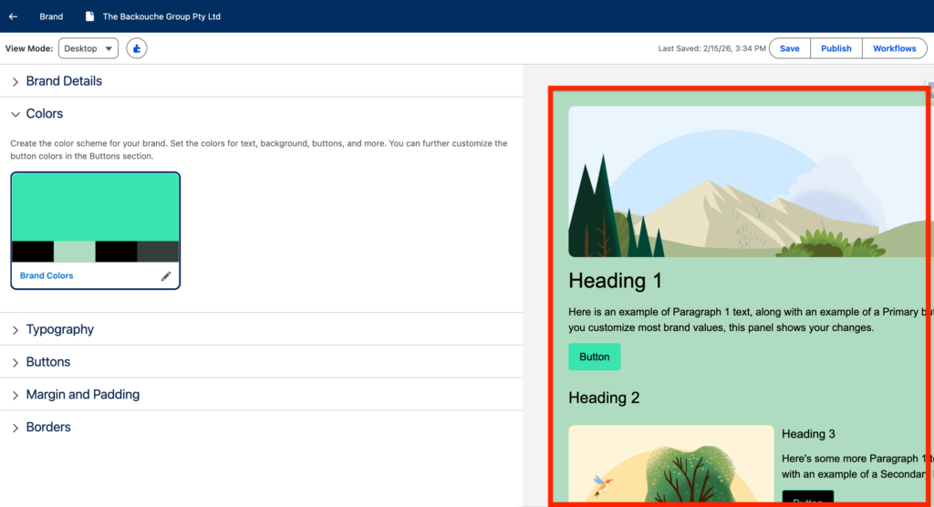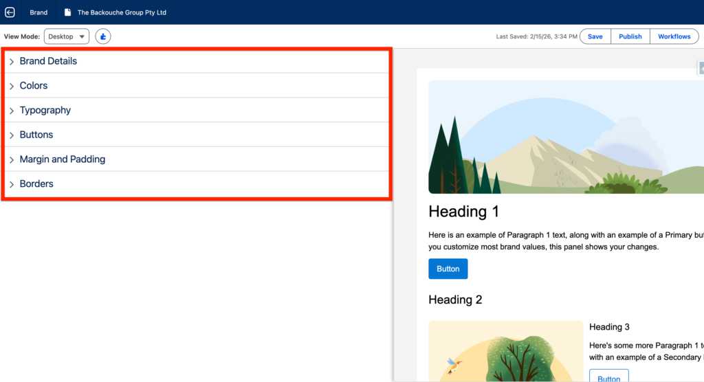 After making updating the details on the left brand panel you will have the possibility to preview what it will look like within an email template/landing page on the right panel – it is very handy to be able to visualise directly the brand guidelines.