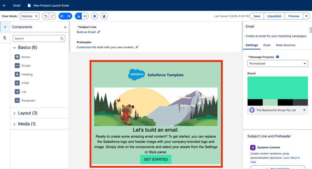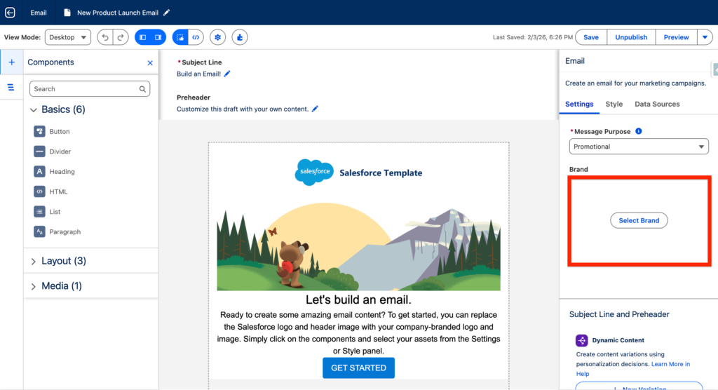 Now let’s navigate into a brand new email in Marketing Next. As you can see on the right panel there is a button Select Brand. Click on it and select the Brand.