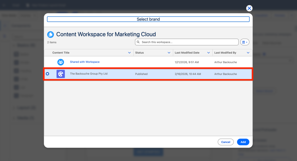 A pop-up window is now opening giving you a view on the CMS folder Select the Brand that we have created together initially and click Add.