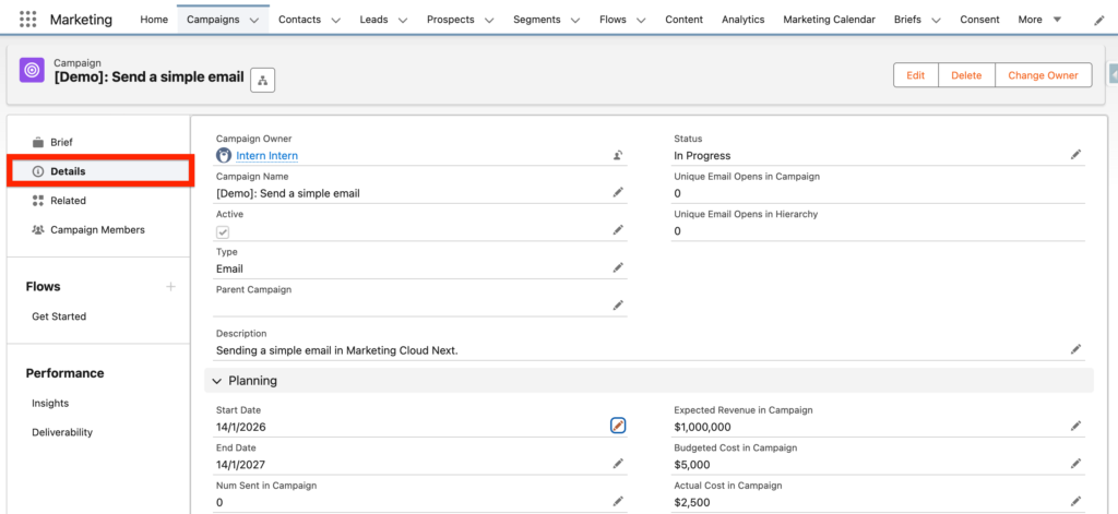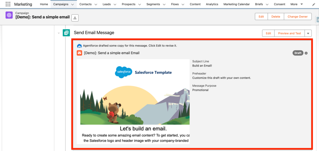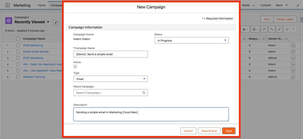 - Description: The objective of this campaign is to send a simple email in Marketing Cloud Next. This is a demonstration.
