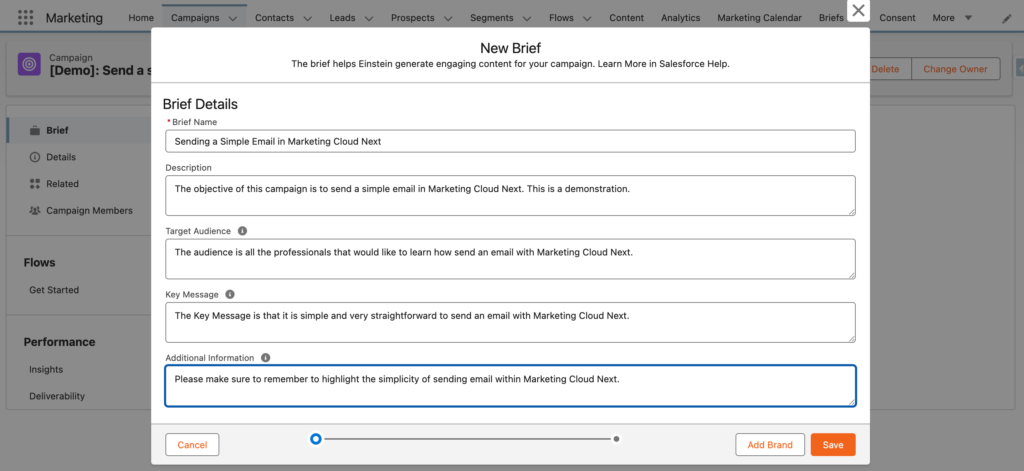 A Brief in Marketing Cloud Next allows you to determine the purpose and objective of your Marketing Campaign – What is the end goal of your Marketing efforts. Interestingly it allow help Einstein to generate engaging content for your campaign.