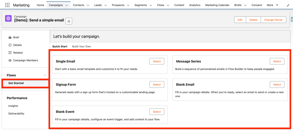 When creating a new Flow within the Campaign record of Marketing Cloud Next you will have the possibility to select a range of different actions such as: