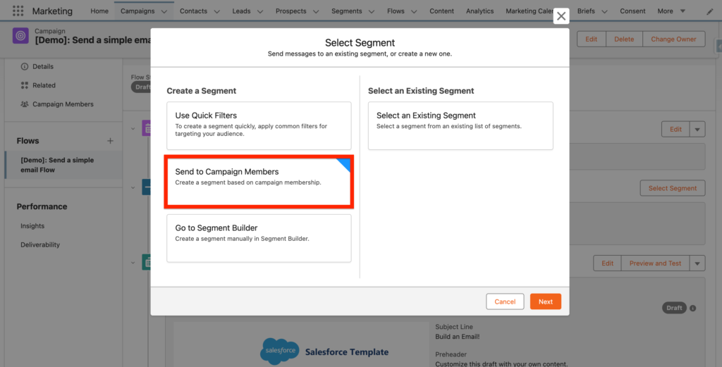 - Send to Campaign Members: Create a segment based on campaign membership.