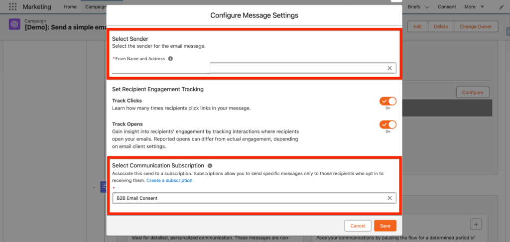 The very last step will be to click on Configuration. This will allow you to select the Sender for your email as well as the Communication Subscription channel.