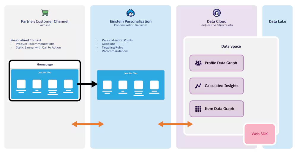When a visitor lands on your website, the Web SDK captures their behavior and sends it to Salesforce Personalization. Personalization uses decisions and targeting rules to determine what content to show, pulling from Data Cloud where customer profiles, product data, and calculated insights are stored. Based on this information, Salesforce Personalization delivers personalized product recommendations and content back to the website in real-time, creating a tailored “Just for You” experience for each visitor.