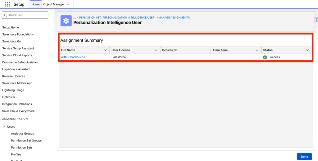 Give the permission set named ‘Personalization Intelligence User’ to your user (Arthur Backouche).