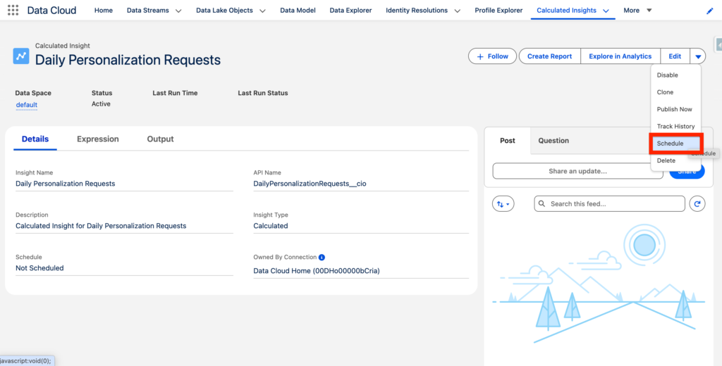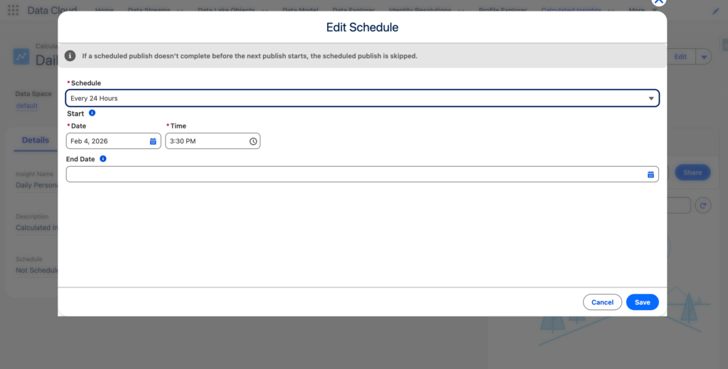 Navigate to the Data Cloud App and click on the Calculated Insights Tab. Edit the Calculated Insights Daily Personalization Requests and Daily Personalization Uniques and schedule them on a daily basis (24 Hours Refresh Rate).