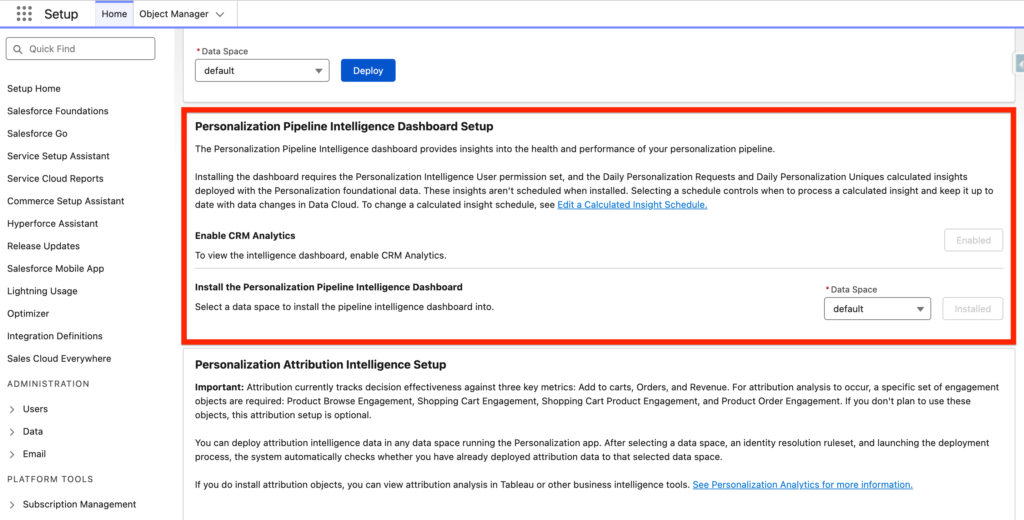 After that navigate back to the Salesforce Personalization Setup and within the Install the Personalization Pipeline Intelligence Dashboard Section click ‘Install’.