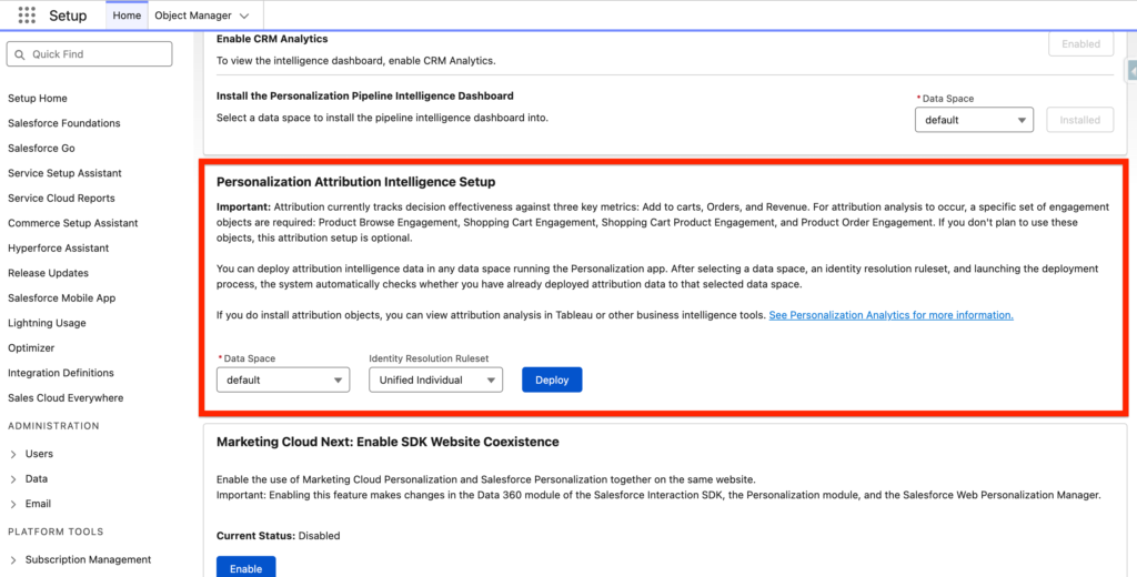 Finally we will not enable the last feature that is only required if we are using Marketing Cloud Personalization alongside of Salesforce Personalization.