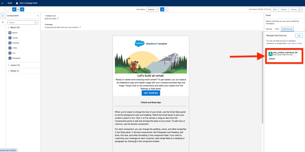 In Marketing Cloud Advanced the Email Builder relies on the Data Graph in order to Personalise the email copywriting throughout the Merge Fields. You can pre-visualise the Data Graph selected by clicking on the ‘Data Source’ Tab on the right panel of the Email Builder.