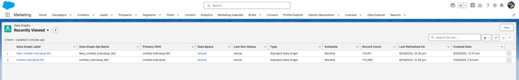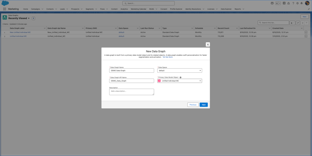 A Data Graph is a unified view of all your customer data that connects and relates information from multiple Data Model Objects into a single, coherent structure allowing faster processing time for Personalization and Segmentation.