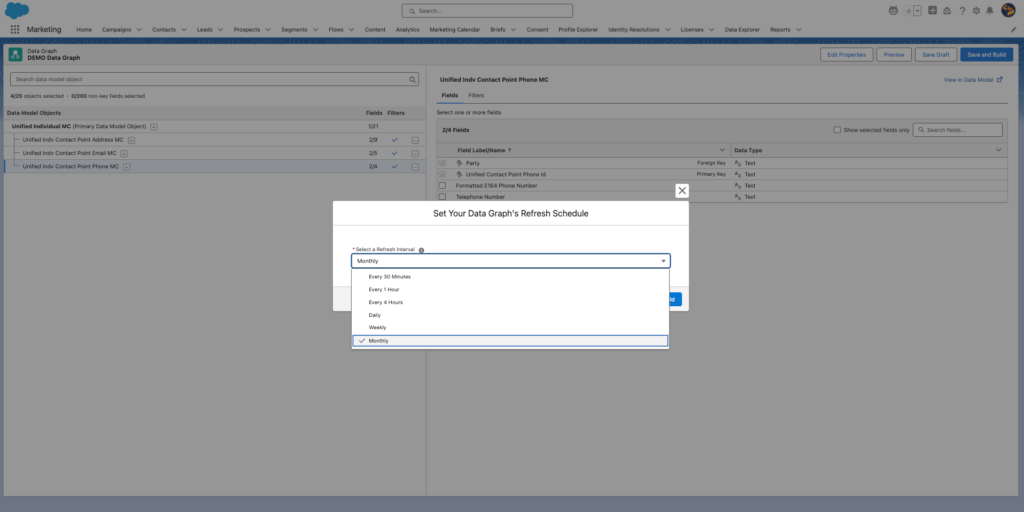 After clicking ‘Save and Build’ a pop-up window will appear asking you how often you would like the data to refresh. You can schedule a refresh from every 30 min to once a month based on your needs.