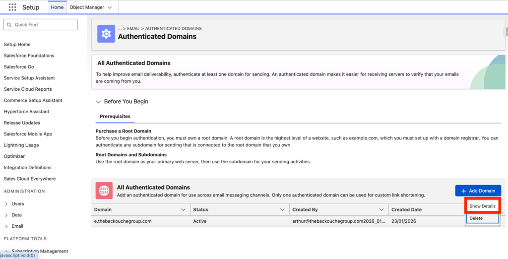 In Authenticated Domain click on ‘show details’ on the domain that we previously configured, in our case ‘thebackouchegroup.com’.