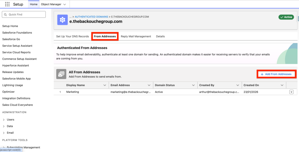 Within the page related to the domain, click ‘From Addresses’ and ‘+ Add From Addresses’. Please note that we already configured the one email address ([email protected]) within the initial Email Sending Set-up.