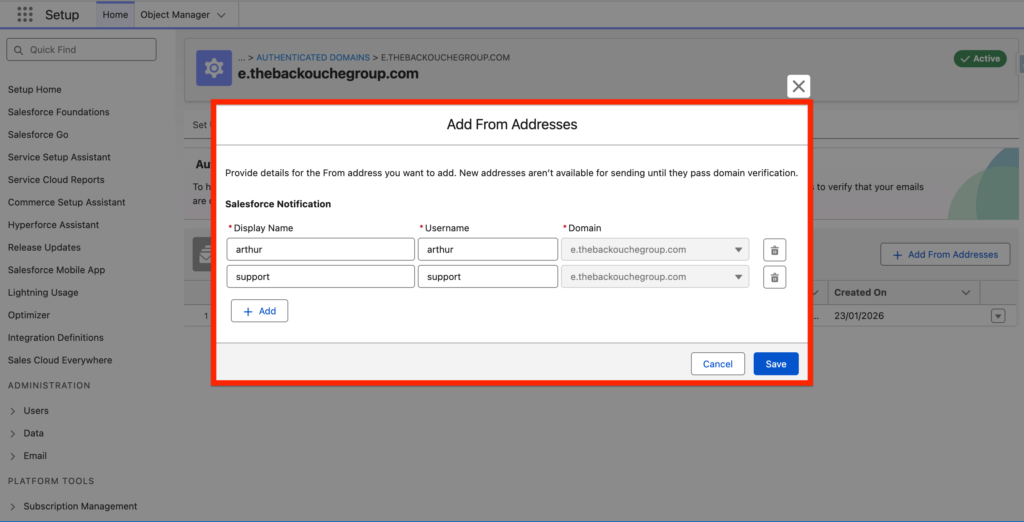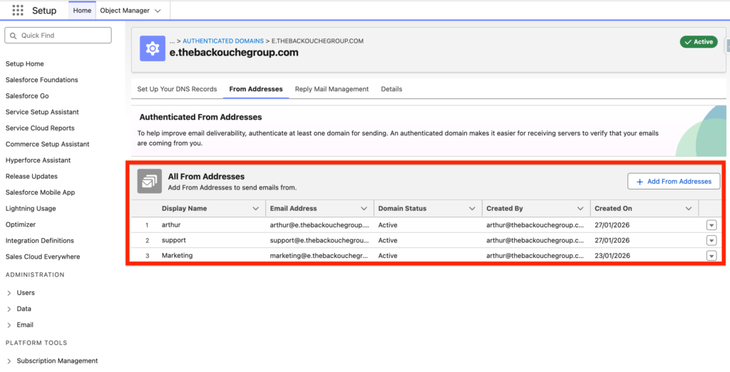Perfect! I can now see that I have 3 email sending addresses configured in Marketing Cloud Next.