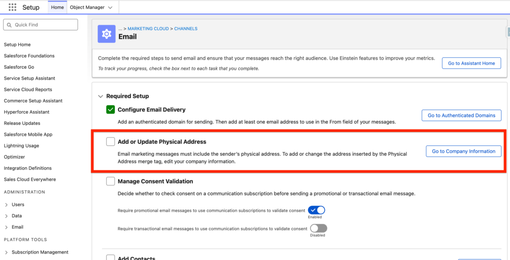 Navigate into Salesforce Set-up, Assistant Home then Set-up Email and within the ‘Add or Update Physical Address’ section click on on ‘Go to Company Information’.