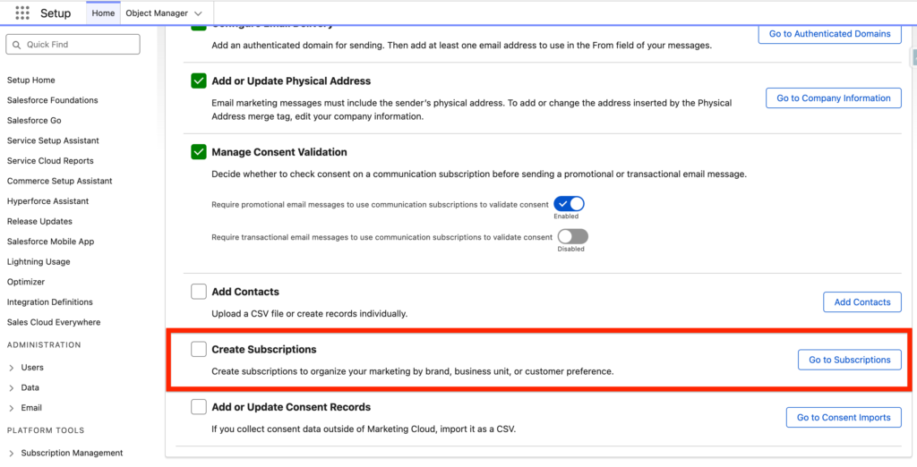 In Marketing Cloud Next you will have the possibility to create subscriptions to organise your marketing by brand, business unit, or customer preference. It can be useful if your organisation have multiples verticals/segments – in order to personalise the customer experience i.e. a Real Estate Website could have multiple Subscriptions such as ‘Residential Leasing, Residential Buying, Commercial Leasing, Commercial Buying’. By having these Subscriptions available the customer can pick and receive emails that are related to his interest only. Click on ‘Go to Subscriptions’ within the Create Subscriptions section.