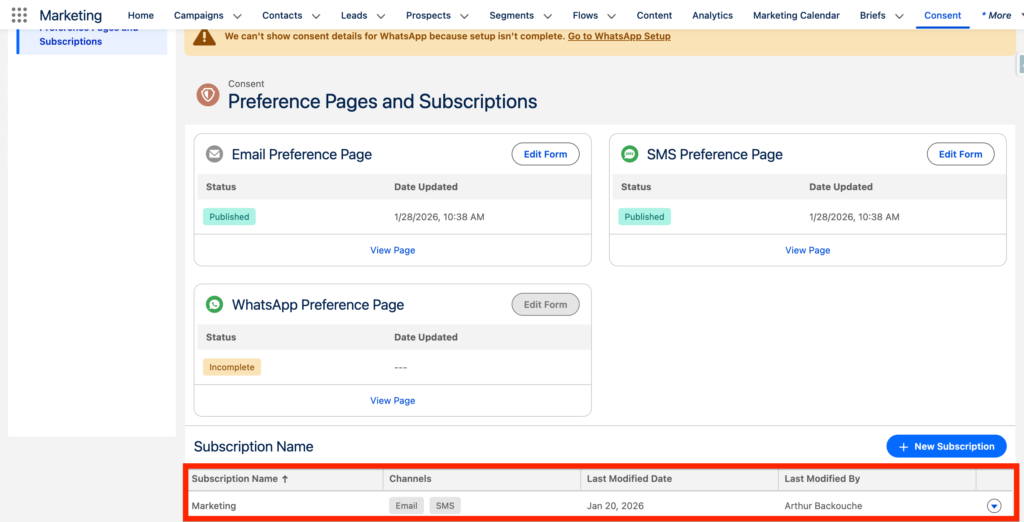 As you can see at the bottom of the page you will have an existing subscription named ‘Marketing’ – this is the default one. I would recommend organisations with small Marketing Teams to stick with a single subscriptions.