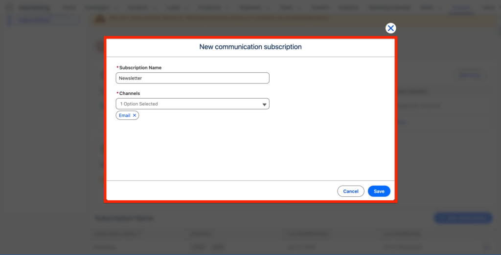 If I would like to create a new Subscription I can do so by click ‘+ New Subscription’ and giving it a Name such as Newsletter and a Channel associated such as ‘Email’, then click Save.