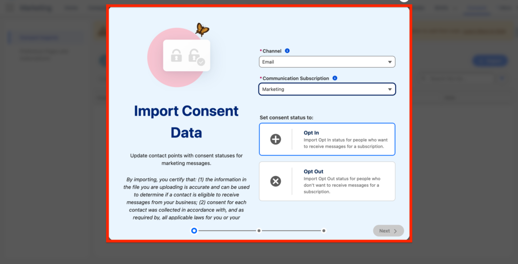 From there, you will have the possibility to select a channel such as Email, and a Subscription such as Marketing (The Default Email Subscription) and then you will be asked to upload a csv file that contains the email address of your individuals – After that they will be opted-in to this channel automatically.