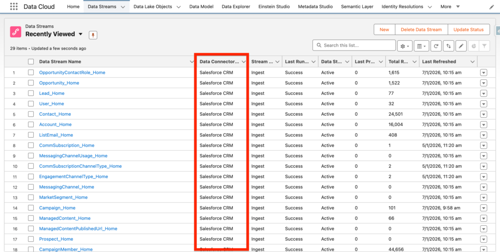 After deploying the Data Stream created from Salesforce CRM bundle you will be able to see all the Data streams created in the list view, and can notice that the column Data Connector is equal to ‘Salesforce CRM’.