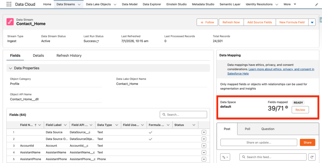 In a lot of different scenarios, you will need to import Custom fields into Data Cloud. As you can see on this screenshot only the 39 fields out of 71 from the Contact Object are mapped to Data Cloud Data model objects.