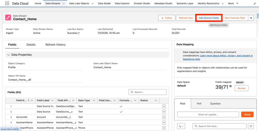 Firstly you will need to navigate to your Data Stream and click ‘Add Source Fields’ to import new fields from the Contact Object into the Contact Data Stream.