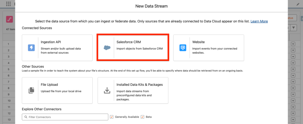 The most common use-case to get started with Marketing Cloud Next will be to ingest Data from Salesforce CRM. In order to achieve that we will simply go into Data Cloud Cloud, click the tab Data Streams, New and then create a Salesforce CRM Data Stream.