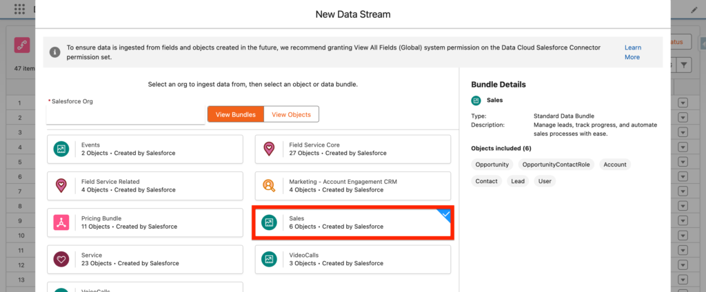 The second step will be to select a Bundle, essentially it is pre-grouped objects and fields from a system (in this case Salesforce Sales Cloud), pre-defined by Salesforce. The advantage of using bundle is that it guarantee a smooth ingestion process. It is the best way to kick-start the ingestion process